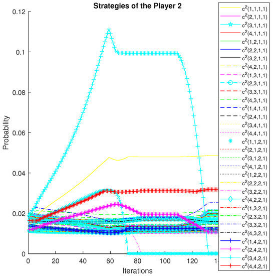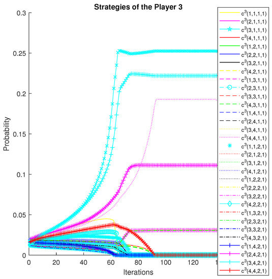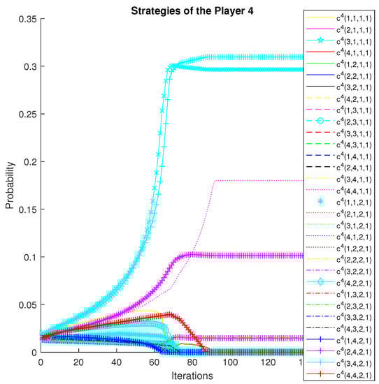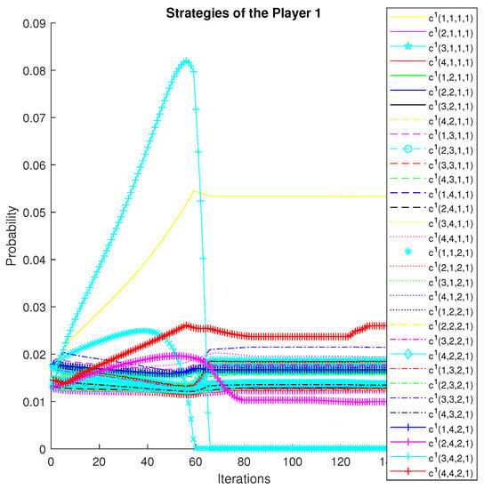 Depending on the interpretation of the oligopoly, action a can represent the choice of a price, quantity, location, etc. It can also represent a vector of choices. Firms act in discrete time, and the horizon is finite. The convergence of strategies for the manipulating players is illustrated in Figure 1 and Figure 2; the convergence of strategies for the manipulated players is shown in Figure 3 and Figure 4.