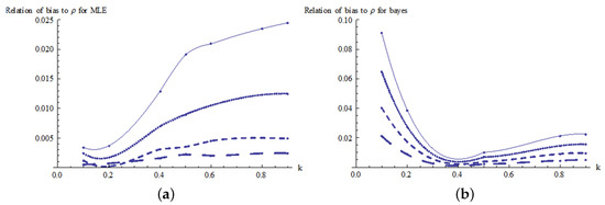 Relationship of bias to k for Pianka’s coefficient: (a) relation of bias to for the MLE estimator and (b) relation of bias to for the Bayes estimator.