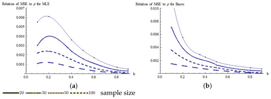 The estimates of MSE are plotted in Figure 7 for the MLE and Bayes estimators. From these results, it can be seen that the MSE decreases significantly as the sample size increases. Figure 7a shows that for small k values and small sample sizes, there is a significant increase in the MSE for the MLE estimator. For the Bayes estimator, Figure 6b and Figure 7b show that both the bias and the MSE decrease as the value of k increases.