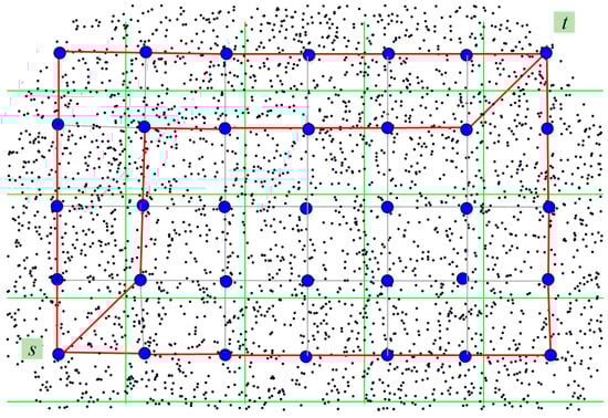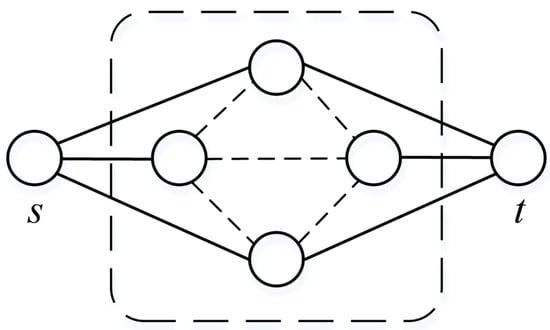 In the case of dependent routes, it will be limited to the transmission speed of the slowest common section [17]. In wireless networks, routes are dependent if the transmission over any part of them depends on the activity of nodes of another route (i.e., sections do not necessarily have to be common); it is enough that the nodes are in a mutual communication (or influence) zone [18,19]. Therefore, it is impossible to construct completely independent routes. At least the first and the last sites should always be considered common because simultaneous transmission to them is possible only by one of the routes [20]. Figure 1 shows a graphical interpretation of the multipath routing model between the source node s and the destination node t.