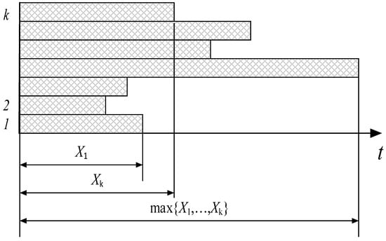 The delivery time over the group of routes T is also a random variable determined by the slowest route from W. The transmission process is terminated when all data transmission is complete. Figure 2 presents the transmission process over a route group.