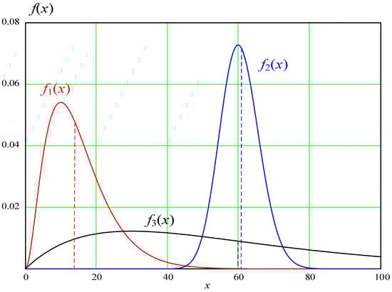 where k and θ are distribution parameters. We consider plotting the probability density function for a network with three available routes (i.e., n = 3), where k = 2. We consider a random delivery time over the selected routes with the values x1, x2, and x3. The considered mathematical expectations of these random variables are introduced as follows.