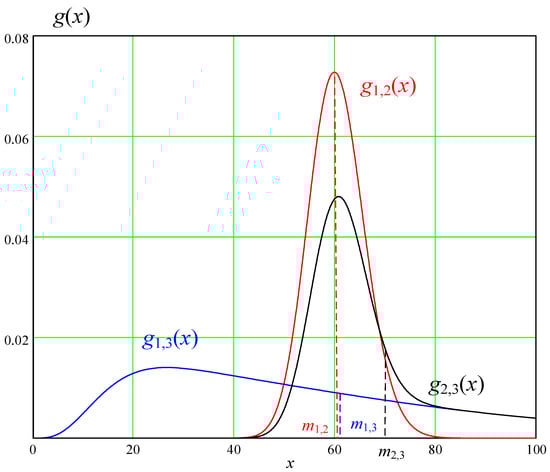 Figure 4 shows the probability density functions of possible choice results: g1,2(x), g1,3(x), and g2,3(x). According to Equation (5), the probability density is defined for the resulting solutions as follows.