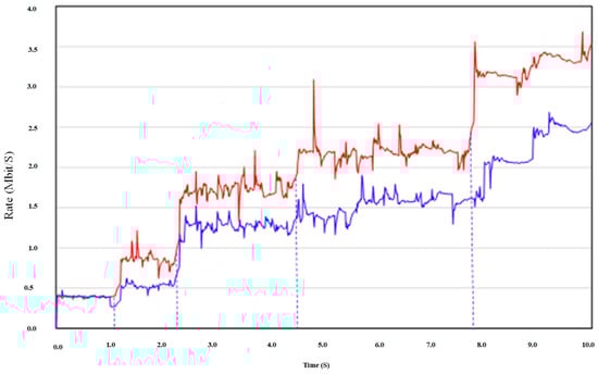 Figure 6 presents the obtained data rate of the simulation during the first ten seconds. The introduced results are for the network with the proposed route selection scheme and the traditional routing. The considered traditional routing scheme was the multipath optimized link state routing (OLSR) protocol [27]. The OLSR protocol supports the use of multiple parallel routes; however, the proposed method focuses on choosing a group of these routes. The developed route selection scheme increases the network speed by selecting the optimum routes and transferring data over them.