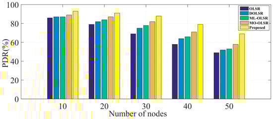 Since packet delivery is used as a performance metric of routing schemes, we considered it as a key performance indicator of the proposed model. Packet delivery maps to communication overhead and route failure. Figure 7 provides the recorded PDR of the proposed multipath routing model compared to the four multipath routing protocols. The delivered packets were recorded for different numbers of deployed nodes. With the increase in the number of deployed nodes, the percentage of delivered packets decreased due to the higher communication overhead. However, the proposed model proved to have higher efficiency than other models even with the increase in the number of deployed nodes. This is due to the reduction of overhead achieved by gathering packets and transmitting over the optimum routes.