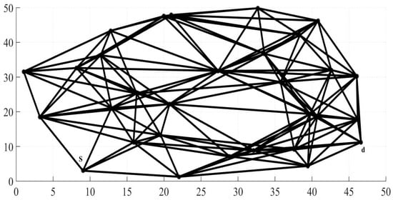 Figure 5 shows the structure of the considered model network, which is an ad hoc network consisting of 32 nodes, including source and destination nodes. All network nodes support the IEEE 802.11 protocol.