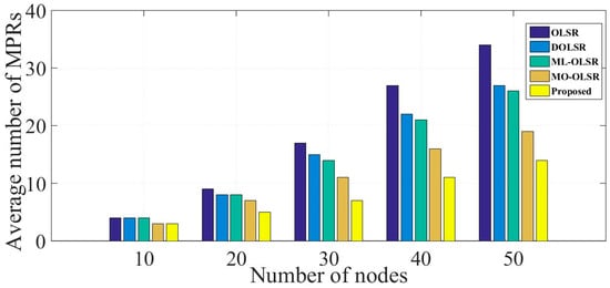 The proposed model reduced the number of intermediate nodes by an average of 17% for the low-density network, e.g., cases 1 and 2. However, it had a higher efficiency in high-density networks, e.g., cases 4 and 5, by reducing MPRs by nearly 34%.