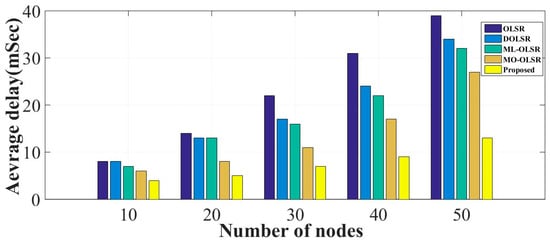 Figure 11 presents the average delay in delivering packets for the proposed and the considered algorithms. The delay was recorded for different numbers of deployed network nodes to investigate the effect of the network density on packet delays. This indicates the robustness of the routing algorithm against network density. The results indicate that the proposed model outperformed the other four models regarding packet delay. This is due to the optimized selection of intermediate paths and parallel routes, which reduces the overall path and the required time for packet delivery.