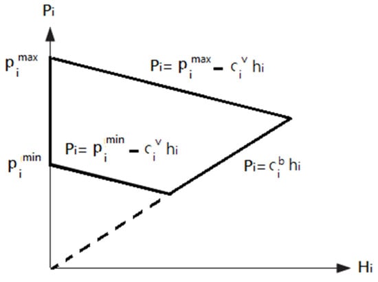 When the unit generates only electricity, should be limited in the range of . The generated heat, , depends on the generated electricity and will be affected by the back pressure (BP) limit, i.e., , where the is the BP coefficient of the i-th unit and is typically in the range of [0.35, 0.75] [57]. Moreover, the is the conversion rate between heating and electricity, which should be satisfied by and and is in the range of [0.1, 0.2]. CHP plants that generate only electricity () are known as condensing (CON) units, with . To maximize efficiency, other plants can only generate heat and electricity in a fixed relationship that works at . These types of CHP plants are known as BP units, with [57].