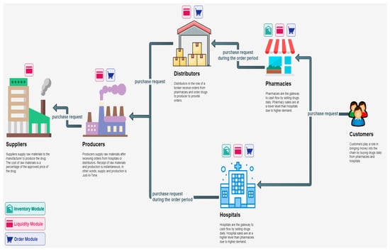 In this study, we investigate a three-level supply chain. The lowest level consists of customers (the starting point of the chain), sellers (pharmacies and hospitals), and distributors (intermediaries). Inventory, as one of the crucial aspects of supply chains, is also considered [36,37]. Customers are the ones who inject cash flow into the chain, and it is they who purchase their medicine from two kinds of establishments: pharmacies and hospitals. If an establishment receives an order for medication, it will use its available stock to supply as much of that medication as possible from its current inventory. If a product ordered is out of stock, it is recorded as a lost sale. As for pharmacies, they procure what they need through distributors to meet their specific needs.