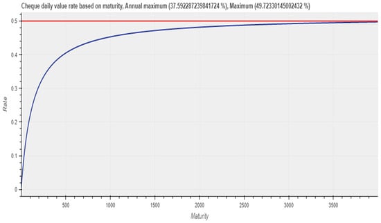 Establishing a primary treasury is an approach for dealing with the negative liquidity level that precedes obtaining banking loans. This approach, an innovation in the proposed model, involves purchasing and selling non-cash assets, including checks. Each asset is subject to value amortization over time, and checks are no exception since they lose value as they approach their maturation date due to a mathematical function called the yield curve (Figure 4). Efficiency curves are examined to obtain the criterion and shape of the function. Various models are used to describe the yield curve in different periods. The yield curve can be modeled based on the interest rate and period and features like the futures rate, the discount rate, and the zero coupons. The Nelson-Siegel (N.S.) model is a parametric model consisting of three factors: surface, S, and arc [38]. The NS model has undergone several changes over the years. For instance, Svensson [39] added a second arc to the original model and developed a four-factor variation called the Svensson (S.V.) model.