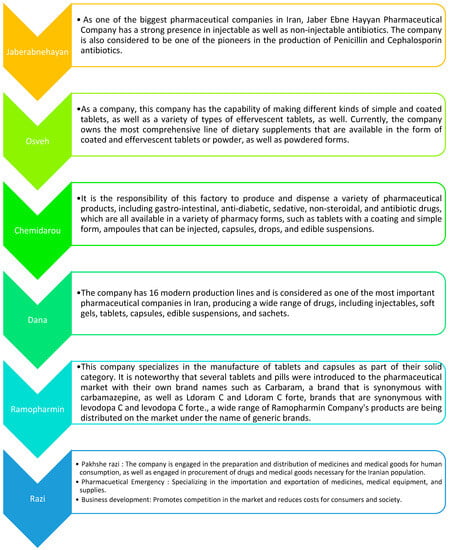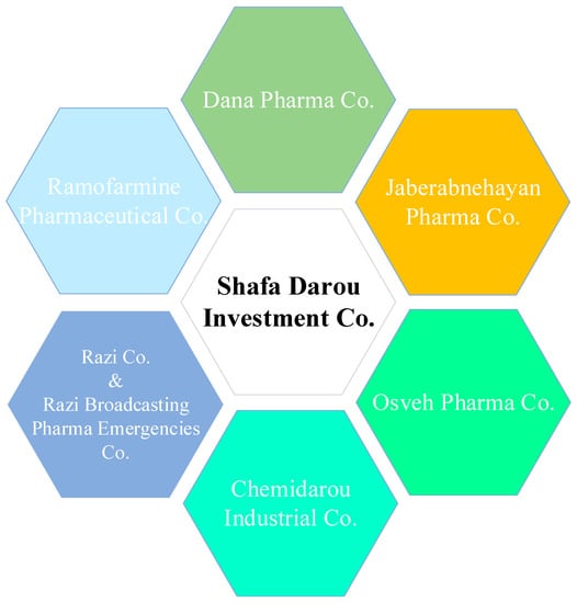 Figure 5. Shafa Darou Investment Company subsidiary companies (http://www.shafadarou.org/ accessed on 1 September 2022) [40].