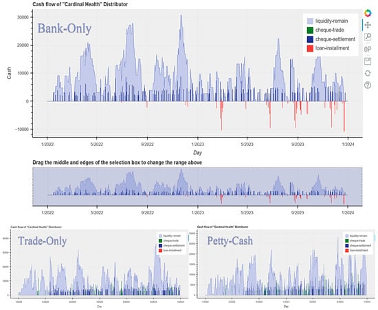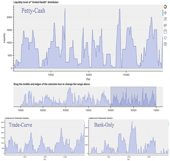 In this study, liquidity is defined as the amount of cash that circulates within the supply chain. According to the parameter definition, this parameter is updated based on various factors, such as the fulfillment of orders, payment of instalments, settlement of checks, and other intra-chain financial transactions. All five nodes have liquidity. There is a lower order volume in pharmacies than in hospitals; consequently, there is a smaller inflow of liquidity to pharmacies than in hospitals.