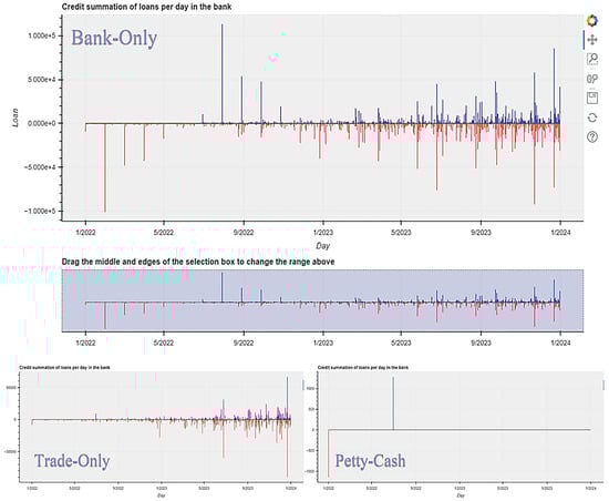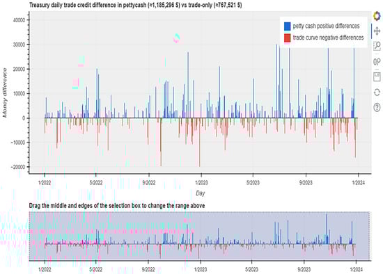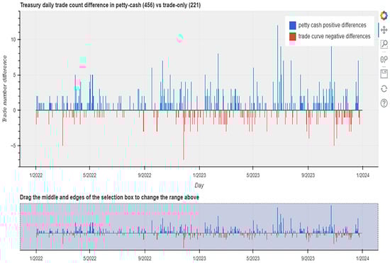 It can be seen in Figure 14 that there is a difference in the number of transactions completed in the primary treasury in the presence of the secondary treasury and its absence. The blue bar represents the positive difference between the number of transactions in each mode. In contrast, the red bar represents the negative difference between the number of transactions in each mode. As can be observed, the number of transactions is higher when the secondary treasury is active.