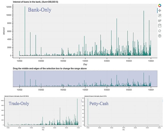 In this subsection, the values of the objective functions in the three approaches are discussed in detail. The financial value of the settled checks in IF-I and IF-II, with a daily interest rate of 0.1%, is moved to the end of the simulation time. The same process is repeated for IF-II, in which the daily interest rate is 0.07%. The values of the objective functions under the three approaches are presented in Table 2. In EF, the transfer value is lower than in IF-I and IF-II because, in EF, there are a more significant number of loans obtained from the bank (i.e., the bank receives a larger amount of interest), and there are no primary and secondary treasuries. It is important to remember that in the IF-I, there is no secondary treasury. Suppose the companies do not succeed in overcoming their lack of liquidity even after selling their checks in the primary treasury. In that case, they must obtain loans from a bank to be able to meet the remaining needs. In light of the fact that this solution implies that the companies are required to pay interest to the bank, the values of objective functions increase compared to EF; however, they remain lower compared to IF-II.