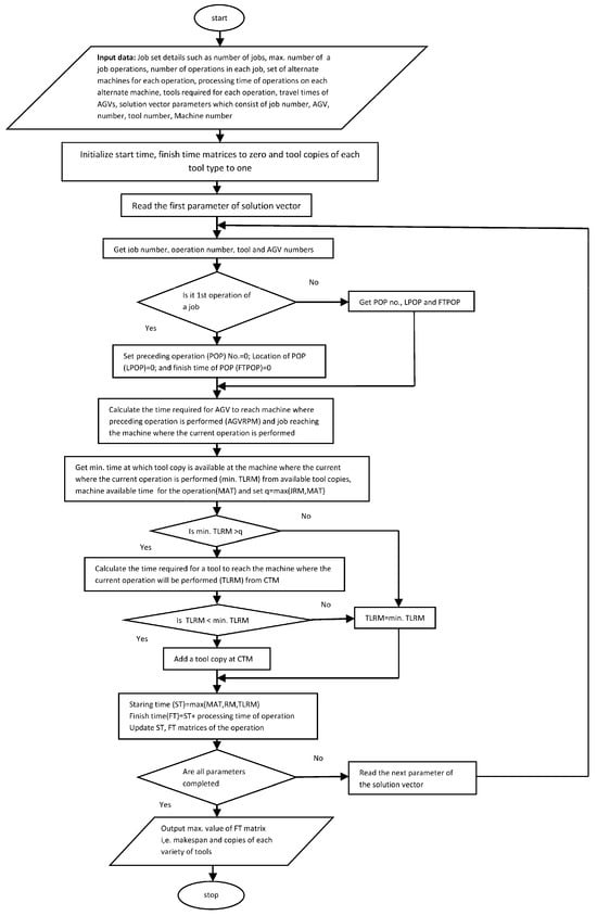 Constrained sets 19, 20, and 21 are connected to the times the TT loaded trips start. They all concur that the TT loaded trip i cannot take off before the prior operation’s maximum finish time and the empty trip there. Operation i can only start after the maximum of the MC’s ready time, the completion times of the AGV and TT loaded trips, according to limitation 22. The times involved for processing are positive, and the decision variables can take on the values 0 or 1. However, because of its scale and nonlinearity, this formulation cannot be solved; hence, a metaheuristic technique known as FPA is utilized to achieve near-optimum or ideal solutions. The computation of the Cmax for a specified schedule needs to be established since it is necessary to reduce the Cmax as much as possible. A flowchart illustrating such a computation is presented in Figure 2.