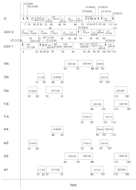 Take a look at operations 5-6. It is clear from Table 9 that the allocated MC, AGV, and tool are 4, 2, and 10B, respectively. The preceding operation, 5-5, was performed at M5. According to Table 12, AGV 2 is currently situated at MC 3, and it is scheduled to perform the empty journey from MC 3 to 5 to collect the part required for operation 5-6. At 202 min, the AGV 2 arrived at MC 5. Because operation 5-5 for MC 5 was finished by 219 min, which may be known from Table 10, AGV 2 had to wait 17 min to pick up the part. AGV 2 collected the component and then continued on its loaded journey. By 234 min, AGV2 will arrive at MC 4. Tool 10B is accessible at CTM, as shown in Table 11. The TT is at MC 5 and must make the deadhead trip to CTM to lift the tool for operation 5-6. When the time was 219 min, the TT arrived at the CTM. Since tool 10B is already on hand, the TT can immediately pick it up from CTM and begin its loaded journey. When the time reaches 236 min, TT will arrive at MC 4. According to Table 10, MC 4 will be ready by 186 min. As soon as the part and tool arrive at MC 4 for operation 5-6, they are loaded into the MC simultaneously to begin the operation. Operation 5-6 is set to begin at 236 min. It will take 5 min to complete the operation. By 241 min, operation 5-6 is complete. The discussion presented applies to every operation in the job set.