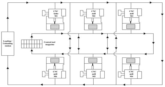 In order to reduce tool stocks, common tool storage is frequently used in several manufacturing systems, where one CTM serves numerous MCs. The needed tool is transported by the TT from the CTM or shared among other MCs throughout the part’s machining. The CTM reduces the tooling cost by reducing the number of tool copies necessary in the system. AGVs and TTs are used to switch jobs and tools among the MCs, respectively. The FMS in this work was presumptively composed of 4 CNC MCs, a CTM with a copy of all necessary tool types, a TT, 2 identical AGVs, and each machine with an automatic tool changer. The FMS distributes parts for production at loading and unloading (LU) stations, and the finished parts are placed at and delivered to the ultimate storage facility, respectively. An automatic storage and retrieval system is available to stock up on the work in progress. Its arrangement is shown in Figure 1. We relied on the presumptions and restrictions in [15] to guarantee the problem’s generality.