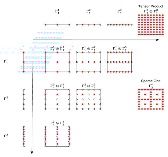 Figure 1 demonstrates the construction of a sparse grid according to the Smolyak rule when and . The meshes are nested, namely, . The 1-d integration-point sequence (, and ) and (, and ) are shown at the top and left of the figure, and the tensor product points are shown in the upper right corner. From (6), we see that the sparse grid rule is a combination of the low-order tensor product rule on with . The point sets of these products and the resulting sparse grid are shown in the lower half of the figure. We notice that some points in the sparse grid are repeatedly used in with . Consequently, we would avoid the repeated points (i.e., only using the red points in Figure 1) and use the reformulation (9), which does not involve repetition in the summation.