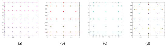 Sparse grids corresponding to the trapezoidal rule (a), Clenshaw-Curtis rule (b), Gauss-Patterson rule (c), and Gauss-Legendre rule (d) when .