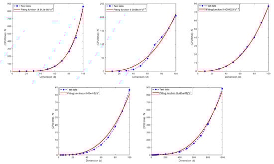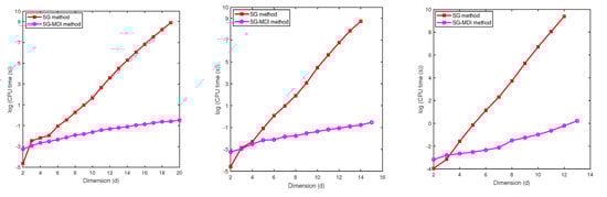 Figure 11 displays the CPU time as functions of d obtained by the least square regression method, whose analytical expressions are given in Table 14. We note that the parameters of the MDI-SG algorithm only affect the coefficients of the fitting functions, but not their orders in d.