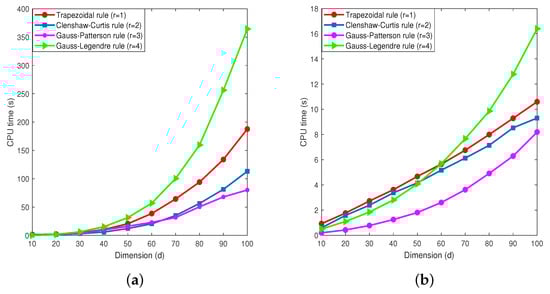 There are four parameters in the d-dimensional MDI-SG algorithm; they are , and q, respectively, where represents the choice of one-dimensional numerical quadrature rule, namely, the (composite) trapezoidal rule (), Clenshaw-Curtis rule (), Gauss-Patterson rule (), and Gauss-Legendre rule (). The parameter m stands for the multidimensional iteration step size in the first stage of the algorithm so the dimension of the integration domain is reduced by m in each iteration. In practice, , and it is preferred to be close to q. In this section, we shall evaluate the performance of the MDI-SG algorithm when . It should be noted that after iterations, the algorithm enters its second stage and the iteration step size is changed to s. Because after the first stage the remaining dimension is small, . It should be noted that after iterations, the residual dimension satisfies . Then, in case or 3, one has two options to complete the algorithm. One either just continues the dimension reduction by calling 3d-MDI-SG or 2d-MDI-SG as explained in the definition of Algorithm 3 or computes the remaining two- or three-dimensional integral directly. The effect of these two choices will be tested in this section. Finally, the parameter q represents the precision level of the sparse grid method. Obviously, the larger q is, the higher the accuracy of the computed results. The trade-off comprises more integration points being used, and hence, more cost. In this section, we test the impact of the q value on the MDI-SG algorithm.