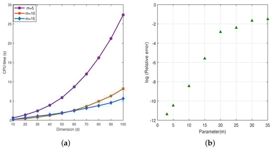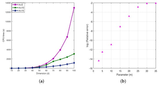 (a) Efficiency comparison of the MDI-SG algorithm with , and for approximating . (b) Accuracy comparison of the MDI-SG algorithm with , and different parameters m for approximating .