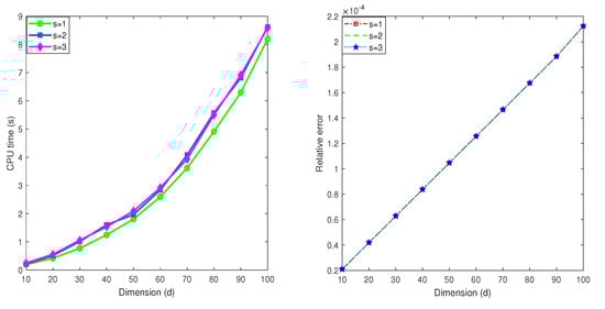 From the Table 5 and Table 6 and Figure 6 and Figure 7, we can observe that when is fixed, as the dimension d increased, the number of iterations of the MDI-SG algorithm also increased, and the computational efficiency decreased rapidly. In practice, the step size m of the MDI-SG algorithm in the first stage iteration should not be too large or too small. One strategy is to use variable step sizes. After selecting an appropriate initial step size m, this can be decreased during the dimension iteration. The next test presents a performance comparison of the MDI-SG algorithm for .