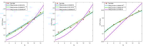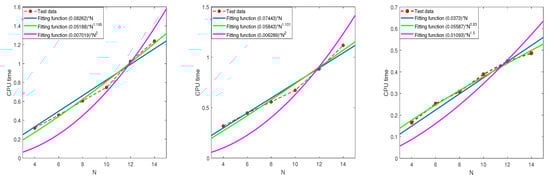 Figure 9 and Figure 10 show the CPU time as a function of N obtained by the least square method and the fitting functions are given in Table 13. All the results indicate that the CPU time grew at most in the polynomial order .