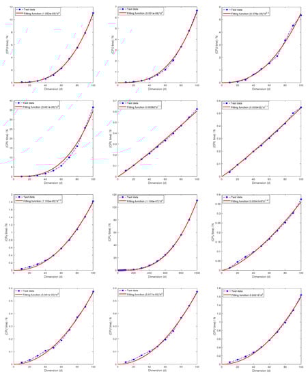 We also quantitatively characterized the performance of the fitted curve by the R-square in Matlab, which is defined as R-; where represents a test data output, refers to the predicted value, and indicates the mean value of . Table 14 also shows that the R-square of all fitting functions is very close to 1, which indicates that the fitting functions are quite accurate. These results suggest that the CPU time grows at most cubically in d. Combining the results of Test 9 in Section 6.1, we conclude that the CPU time required by the proposed MDI-SG algorithm grows at most in the polynomial order .