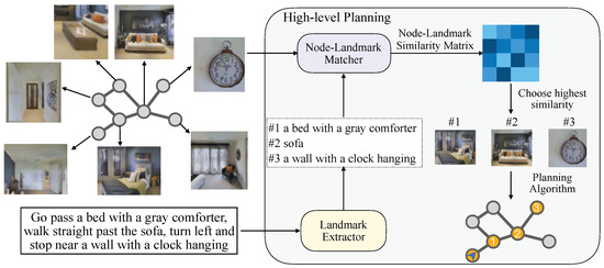 To materialize such an elegant idea, we implement the high-level planning based on two different modalities using two off-the-shelf modules, called Landmark Extractor and Node–Landmark Matcher, respectively. As shown in Figure 5, if the topological map is not discretized enough, the original observation sequence contains a lot of redundancy and noise, which will reduce the efficiency and accuracy of matching. Conversely, if the topological map is too sparse, it will be impossible to distinguish different landmarks in the instruction. We will illustrate this with our experiments in Section 5.1.