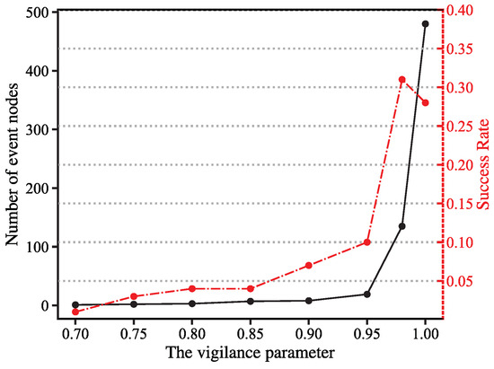Figure 8 shows the effect of from 0.7–1 on the number of event nodes and the corresponding navigation success rate. The results in the figure are the average of 10 scenes. It can be seen that when is in the range of 0.7–0.9, the number of event nodes is smaller than 10. The vigilance parameter represents the similarity threshold between the embeddings of different visual observations, but most visual observations in indoor scenes are relatively similar. The smaller threshold will cause more nodes to be considered similar and very limited nodes to be saved. However, it is difficult to represent a scene structure with very limited event nodes. When , all existing event nodes cannot satisfy top-down matching with a novel input unless the input is exactly the same as one of the existing event nodes. In this situation, all observations of the exploration path are basically preserved, so the final number of event nodes is close to the number of exploration steps.