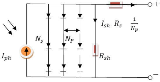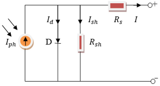 The SDM model is widely used because of its simple structure and high accuracy in extracting and explaining the features of solar cells [68,69]. The SDM’s equivalent circuit for the load current is depicted in Figure 1. The combination of the current source, the diode, and the shunt resistor determines the current through the load. This circuit shows both the leakage current and the electrical resistance of the battery [70]. Here is how you can write down the equation for SDM results: