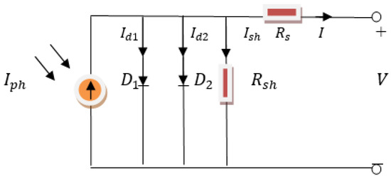 where indicates the first diode current, is the second diode current, indicates the diffusion current, denotes the saturation current, and , are the first and second diode ideality factor, sequentially. Substituting Equations (32) and (33) into Equation (34), we obtain: