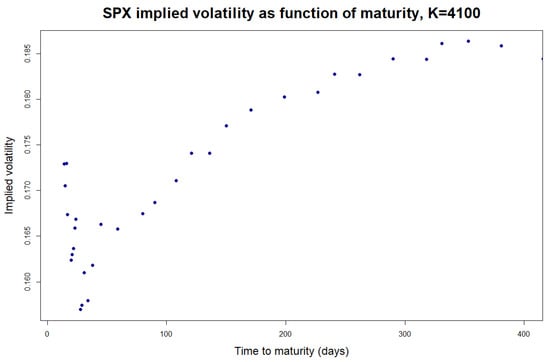 Variation in implied volatility with time to maturity T for a fixed strike K. The values were calculated using S&P500 (SPX) option prices on 3 May 2023, retrieved from finance.yahoo.com [43].