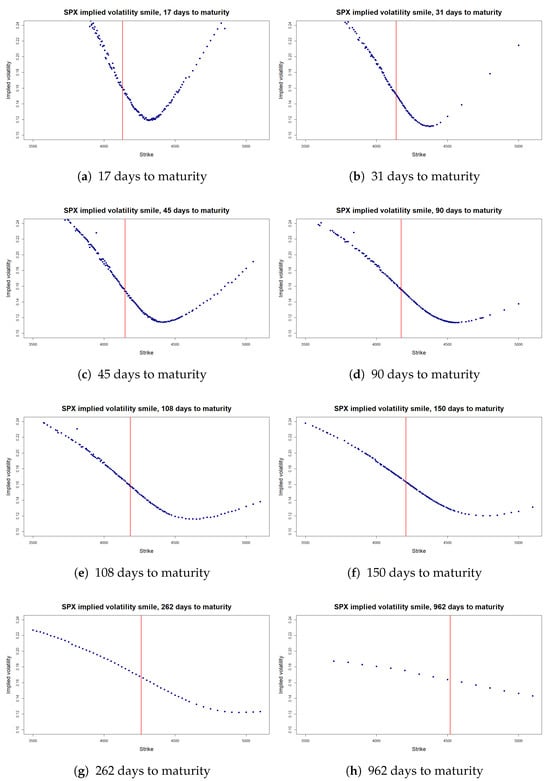Implied volatility smiles for different times to maturity. The values were calculated using S&P500 (SPX) option prices on 3 May 2023, retrieved from finance.yahoo.com [43]. Vertical red lines correspond to the at-the-money level .