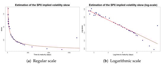 Figure 3. Absolute values of at-the-money implied volatility slopes on regular (a) and log–log (b) scales. Blue dots denote the data and red lines denote the regression fits (a) and (b). The values were calculated using S&P500 (SPX) option prices on 3 May 2023, retrieved from finance.yahoo.com [43].