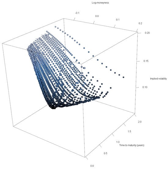 In principle, a “perfect” model should capture the shape of the entire implied volatility surface (or, equivalently, ; see Figure 4). Here, by “capturing the volatility surface”, we mean the established benchmark for assessing the performance of a model by its ability to reproduce the shape of or, equivalently, . As a rule, testing adheres to the following algorithm: