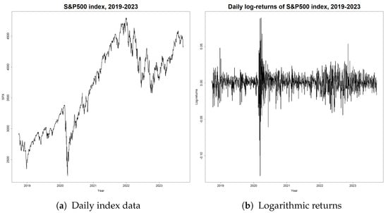 Daily split-adjusted values of the S&P500 (SPX) index (a) and the corresponding logarithmic returns (b). Note that the amplitude of fluctuations in log-returns tends to form clusters over time; the period of the highest variation, in March 2020, corresponds to the shock caused by the COVID-19 pandemic. The data were retrieved from finance.yahoo.com [43].