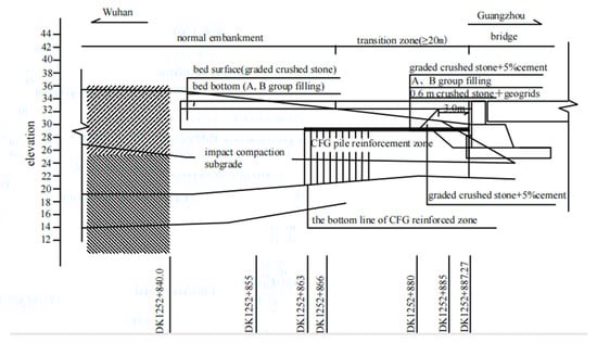 Transition zones are special structures that connect numerous components in high-speed railways (HSRs) such as bridges, culverts and tunnels. The strength, deformations and stiffness of which are distinct from normal subgrade, which inevitably results in settlement differences, and thus represent the weakest sections under high-speed train loads [1,2,3,4]. Cristina [5] conducted on-site tests on the transition zone of a culvert at a Portuguese HSR, revealing that the track displacement of the structure and reinforcement zone were 45% and 30% lower than that of the roadbed, respectively, with minimal changes in longitudinal acceleration along the line. European scholars have suggested that more research needs to focus on transitions [6,7,8]. Researchers in the USA [9,10,11] determined that the stiffness ratio between the bridge and normal subgrade can reach up to 2. Compared with normal tracks, the transition section requires four times more maintenance and double the costs. Therefore, research into the stiffness and dynamic properties of transition zones is critical for the stability of HSRs.