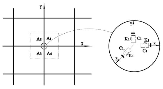 The connection between the spring element and the shell element is shown in Figure 12, which is similar to the connection between the spring element and the beam element. The difference is that when the spring element is located above the shell element, the multi-point constraint equation is