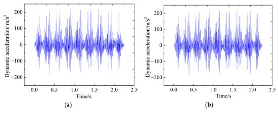 Measured acceleration and deterministic load: In the discrete sampling of vertical orbit vibration acceleration waveform, N was assumed to equal 1024, and the measured acceleration time–history curve after filtering at 330 km/h is shown in Figure 8a,b, whereas the determined wheel–rail interaction force time–history curves are depicted in Figure 8c,d.