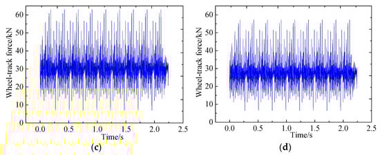 Processing of deterministic load. (a) Time–history curve atDK1252 + 885 section. (b) Time–history curve at DK1252 + 863 section. (c) Wheel–track force at DK1252 + 885 section. (d) Wheel–track force at DK1252 + 863 section.