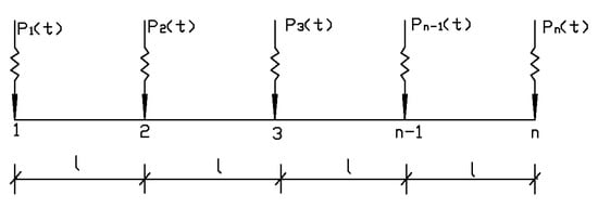 Train load modelling: As shown in Figure 9, let the longitudinal length of the train be l and let the train speed be v. At the beginning, the train is located on node 1, while the train dynamic load p1(t) acts on node 1, then the load p2(t) acts on node 2 after l/v seconds when the train reaches Section 2, and so on. It was assumed that the train passed Section 1 completely after t0 s and the train load ceased to act on node 1, then the train passed Section 2 completely after t0 + l/v s, and the train load ceased to act on node 2, and so on.