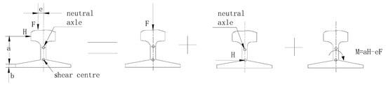 While the vehicle is running on the track, the vertical wheel loads are not forced in the centerline of the track and the transverse loads are not exerted in shear-three-center of the track section, which causes torsion movement on the track. Under general conditions, the track’s vertical and transverse displacements and rotation angles are independent from each other, all of which could be superposed linearly and thus the three aspects may be considered, respectively, as shown in Figure 10. As for the sub-track dynamic response, only the action of vertical wheel loads was considered.