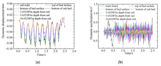 Figure 1 presents the longitudinal section of the bridge approach. In bridge tail section DK1252 + 855, the vibration sensors were buried on the surface and bottom of the bed surface, the center and the bottom of the subgrade to test the dynamic responses of each layer and to verify the model (Section 4). Two accelerometers were attached to the waist of the rail in transition section DK1252 + 885 (bridge tail) and embankment section DK1252 + 863 (normal subgrade) to test the rail acceleration and determinate the train load (Section 3.2). The data were collected with an imc CL-5016-ET data-acquisition system (Germany) at the sampling frequency of 1000 Hz, and processed using the imc famos 7.4-software (Berlin, Germany).