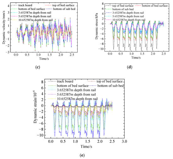 The mechanical properties of the interface between the graded crushed stone and the grade A and B filling layers change suddenly and intermittently. The vertical stress mutates 10 times from the concrete layer to the bed layer. In the above numerical calculation, the elastic modulus of graded crushed stone is about 3.68 times that of the group A and B fillers. Thus, the abrupt change in stress on the interface is not only related to the different elastic modulus, but also to the interface strain on both sides of the material. Stress and strain discontinuities also exist at the interfaces of other materials. The stress discontinuities with an equal magnitude are related to the constitutive properties and strain at both sides of the material. Furthermore, due to the damping effect, the train load dissipates energy in the form of a deeply propagated dynamic wave. Therefore, the dynamic stress attenuates with the increase in depth. The results also confirm this conclusion.