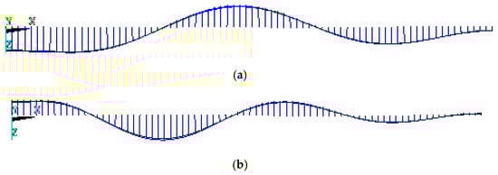 First- and second-order modes in the bridge approach zone. (a) The first order (16.85 Hz). (b) The second order (21.46 Hz).