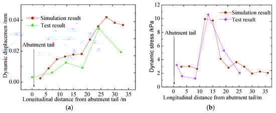 Comparison of measured dynamic results and simulation results. (a) Dynamic displacement. (b) Dynamic stress.