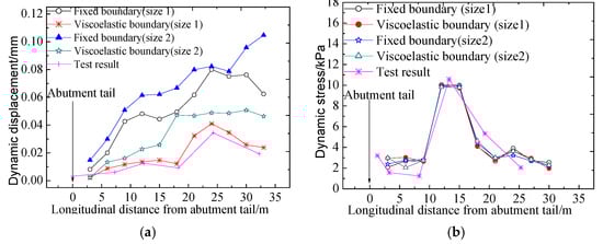 Figure 16 compares the measured results with calculated dynamic displacement and stress with different boundaries and modeling sizes on a bed surface at 350 km/s. Figure 17 reveals the calculated dynamic stress values to be in general agreement across boundary treatment methods and model sizes, and the variation law is essentially consistent with the measured dynamic stress. However, the dynamic displacement varies with the boundary treatment method and model size, and it is evident that the calculated dynamic displacement considering a viscoelastic artificial boundary is closest to the measured value. This indicates that the viscoelastic artificial boundary not only absorbs the energy of the wave at the boundary of the model well, but also greatly reduces the size of the model and increases the speed of the computer.